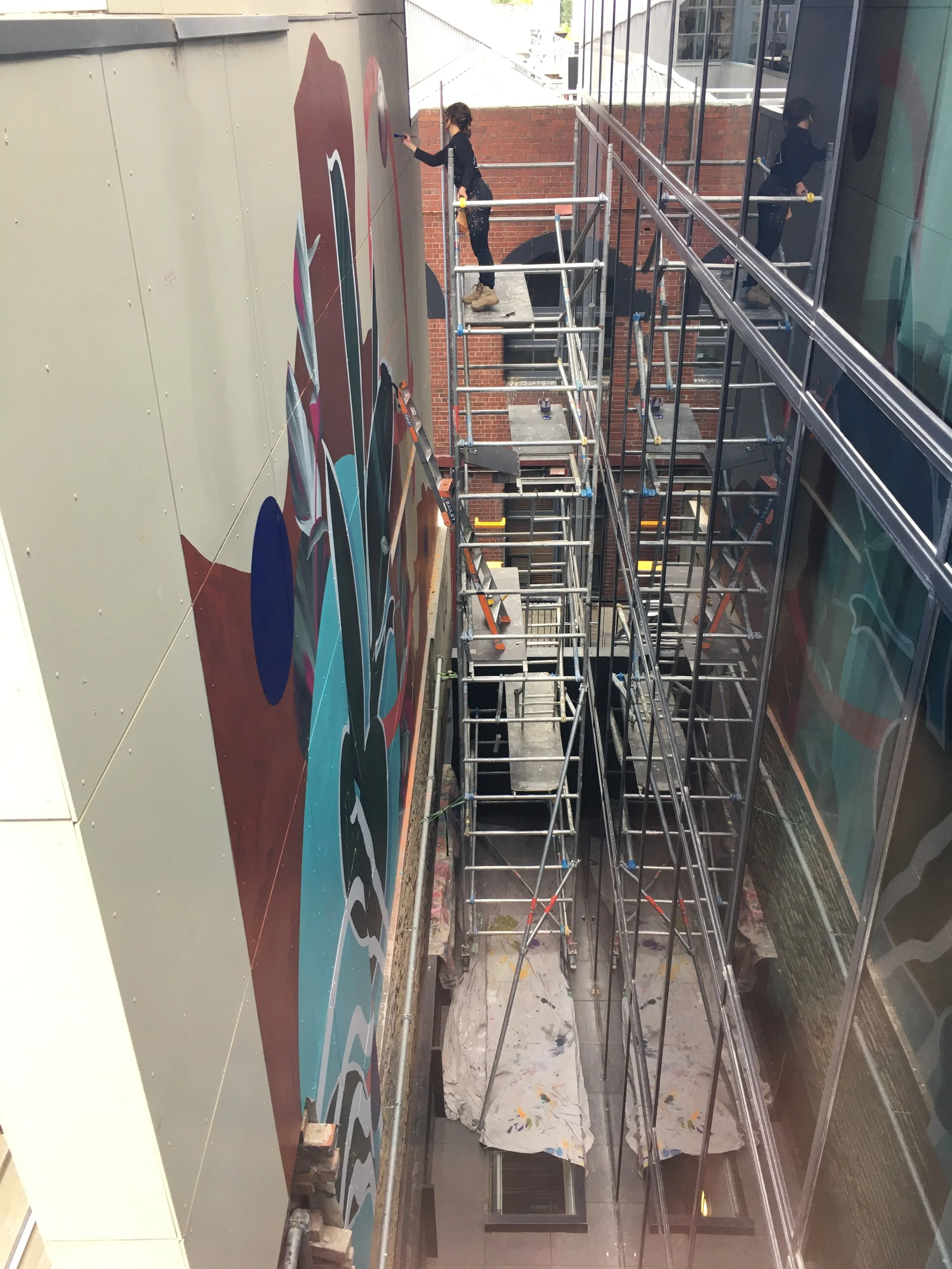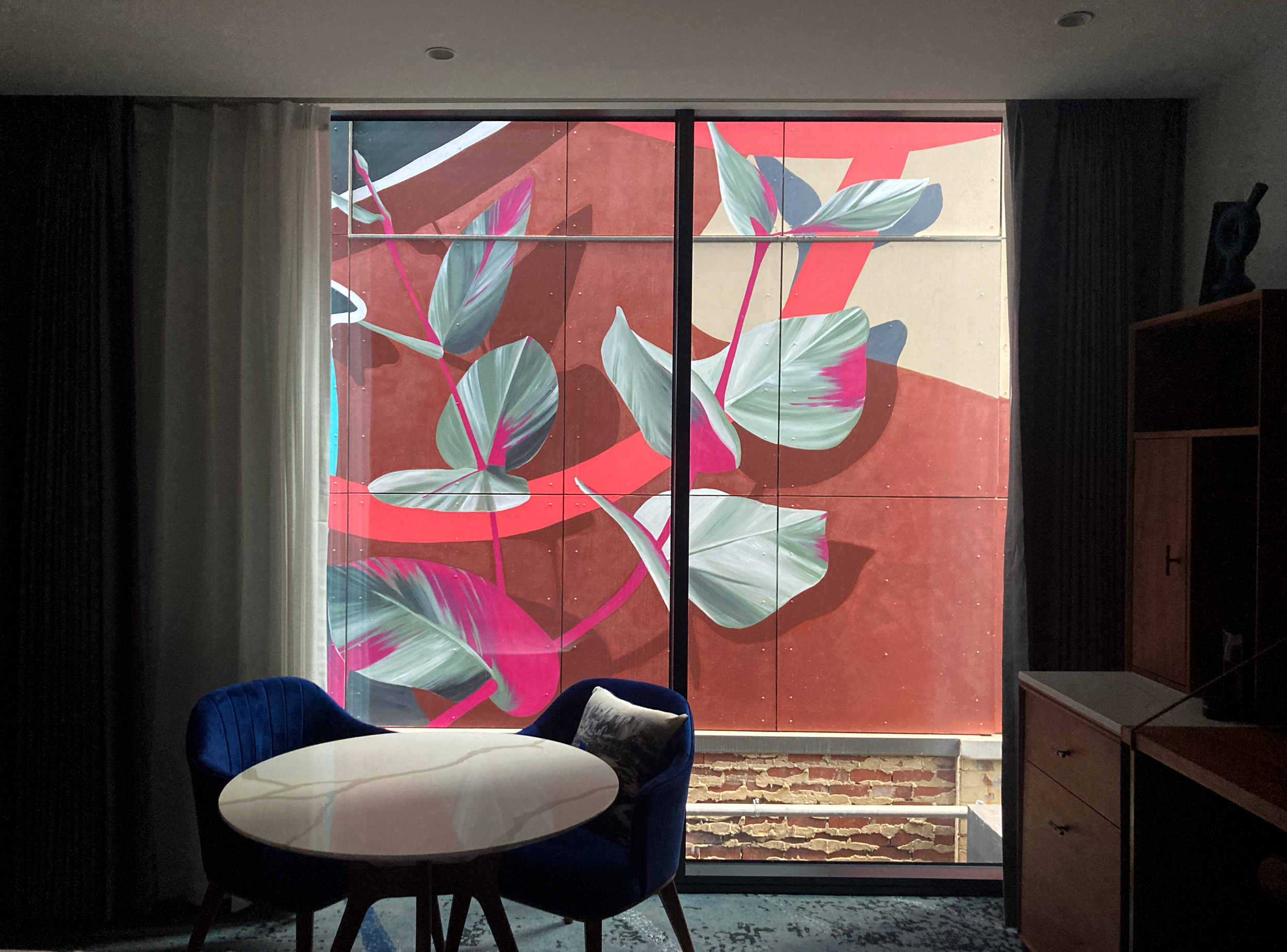 By showcasing pink-tinged eucalyptus sprigs and large green fig tree leaves found at the nearby Fitzroy gardens, my aim was to transform the plain, grey outlook of many of the hotel rooms. Underpinning the design with colour and copper metallics and spanning five levels, opulence and nature were what I wanted the artwork to exude whilst also being a nod to the city’s vibrant street art culture.
